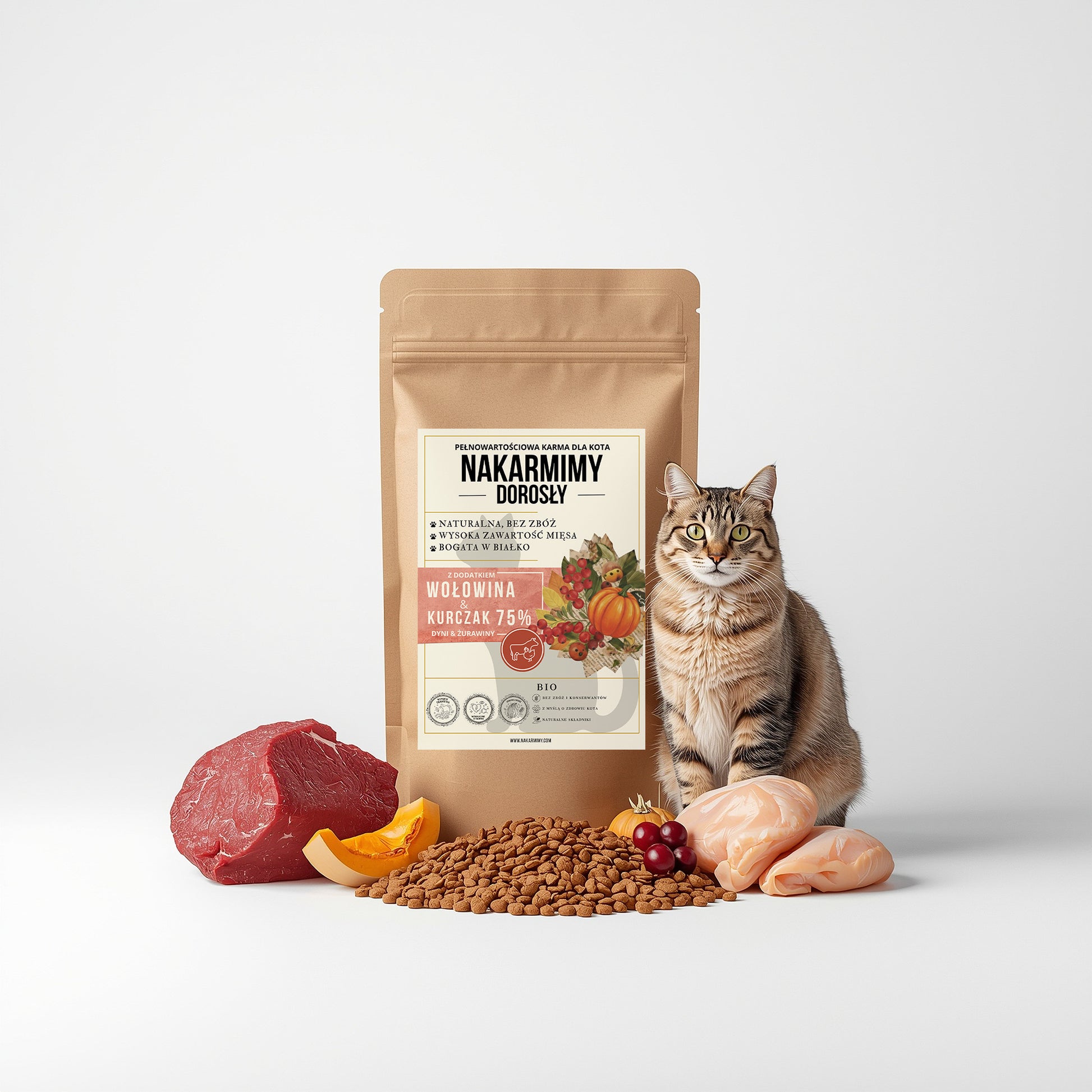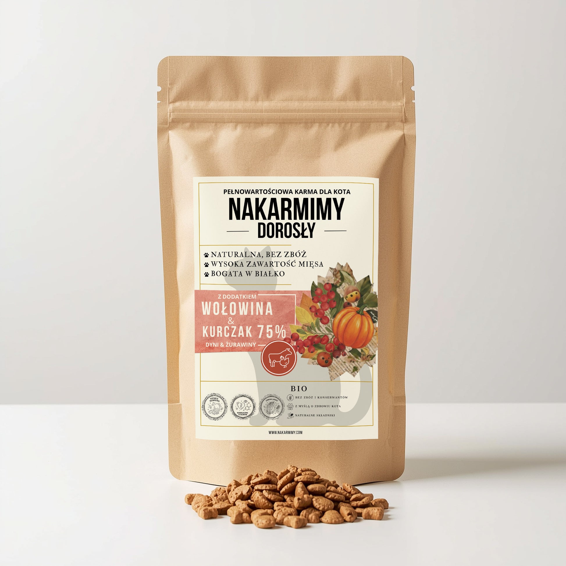 Karma sucha Kot Dorosły NAKARMIMY – Wołowina i Kurczak 75% Dynia i Żurawina