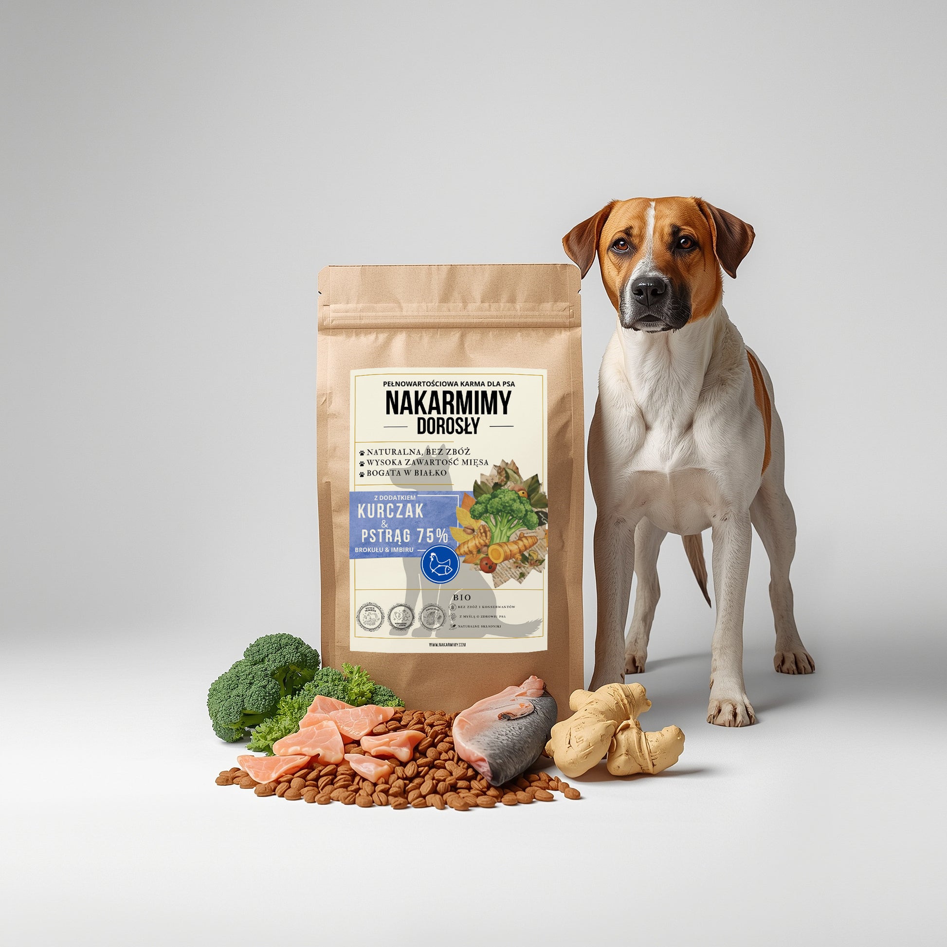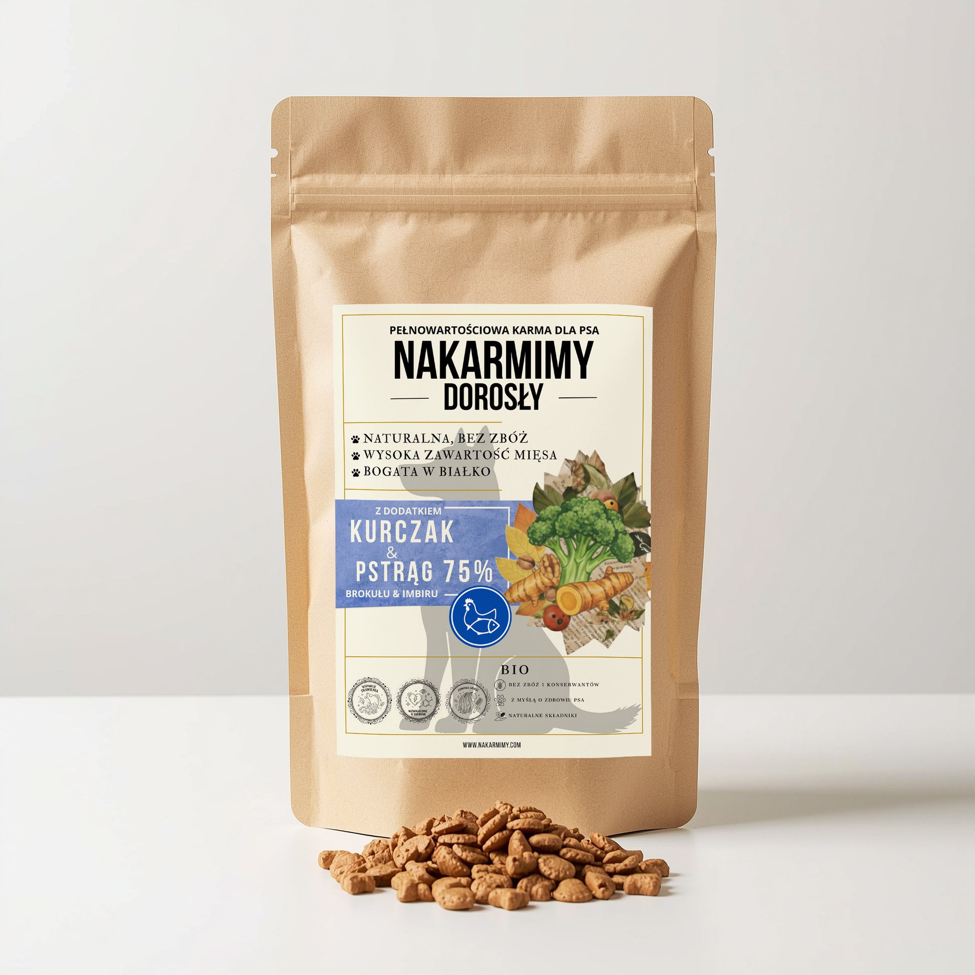 Karma sucha Pies Dorosły NAKARMIMY – Kurczak i Pstrąg 75% Brokuł i Imbir