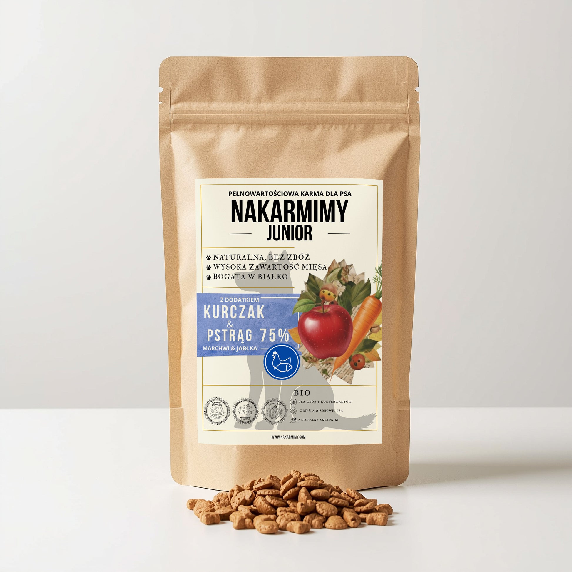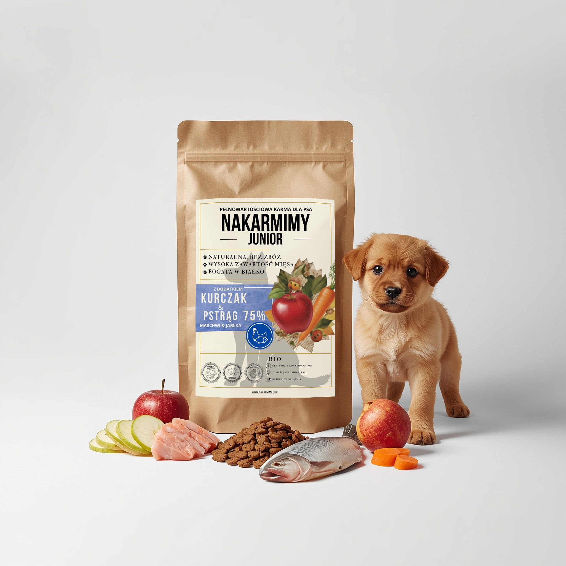 Karma sucha Pies Junior NAKARMIMY – Kurczak i Pstrąg 75% Jabłko i Marchew