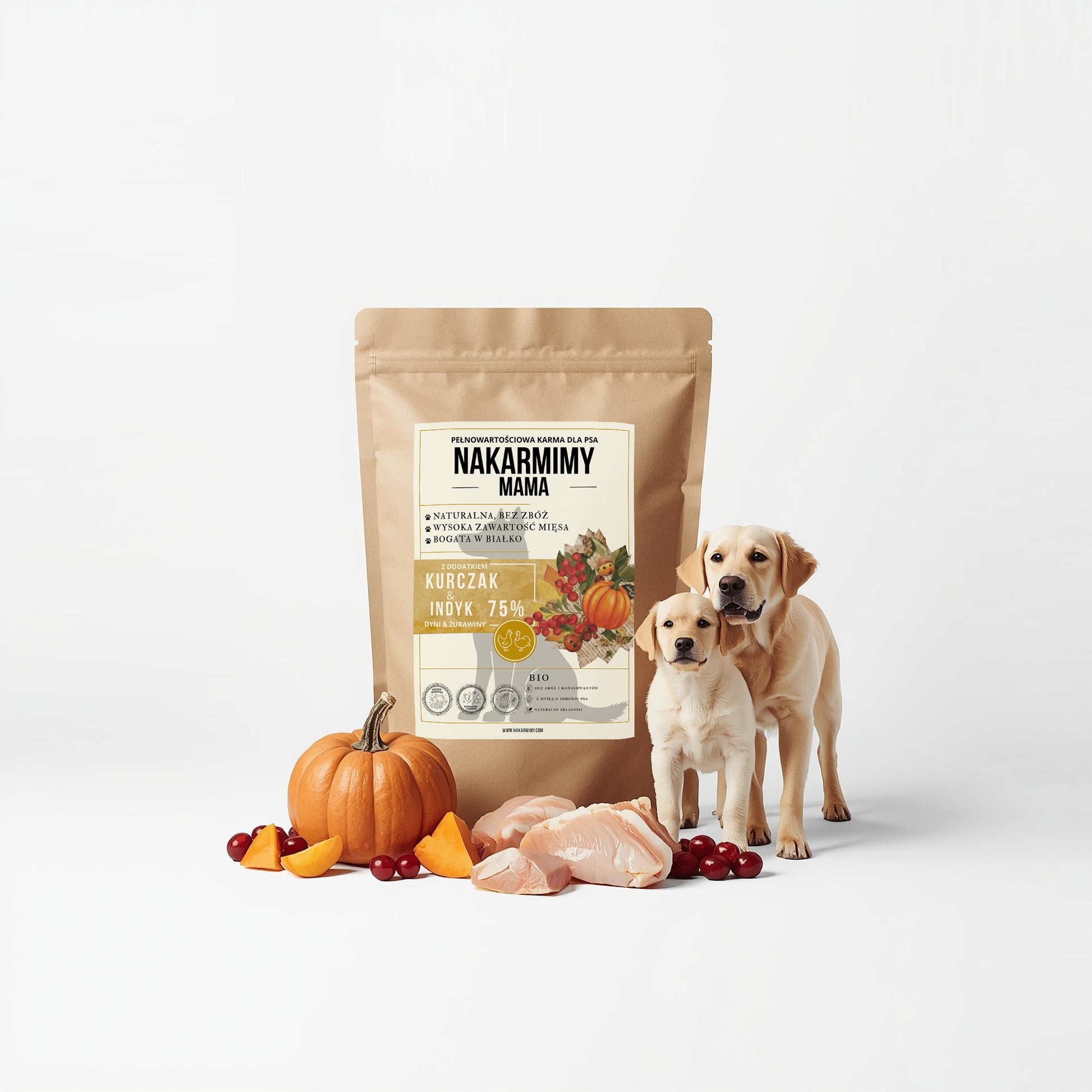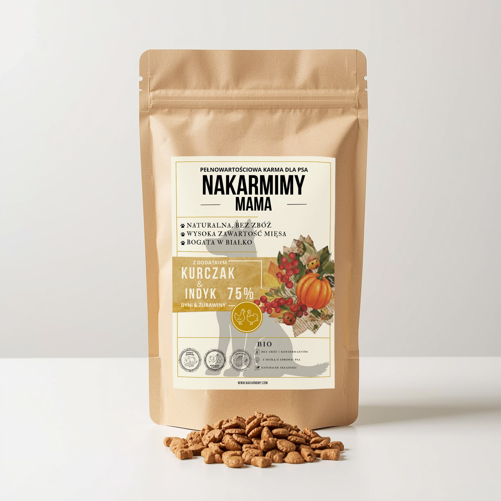 Karma sucha Pies Mama NAKARMIMY – Kurczak i Indyk 75% Dynia i Żurawina