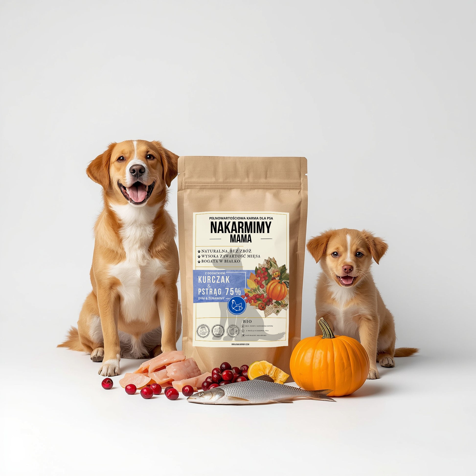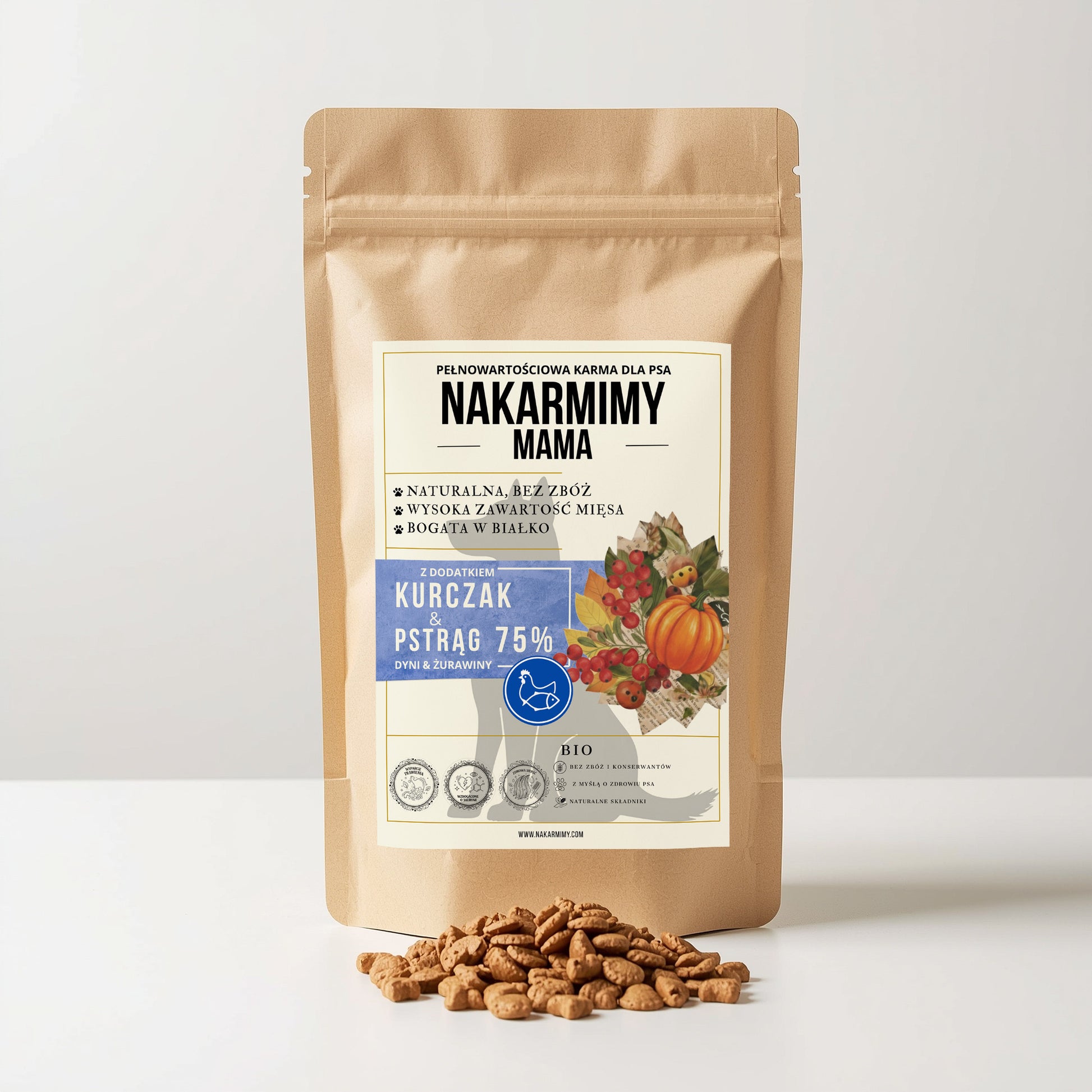 Karma sucha Pies Mama NAKARMIMY – Kurczak i Pstrąg 75% Dynia i Żurawina